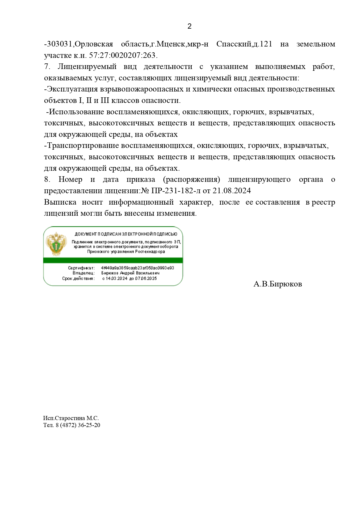 Наша организация обладает лицензией Ростехнадзора № №ЛО57-00109-57/01357958 на эксплуатацию взрывопожаропасных и химически опасных производственных объектов I, II и III классов опасности.